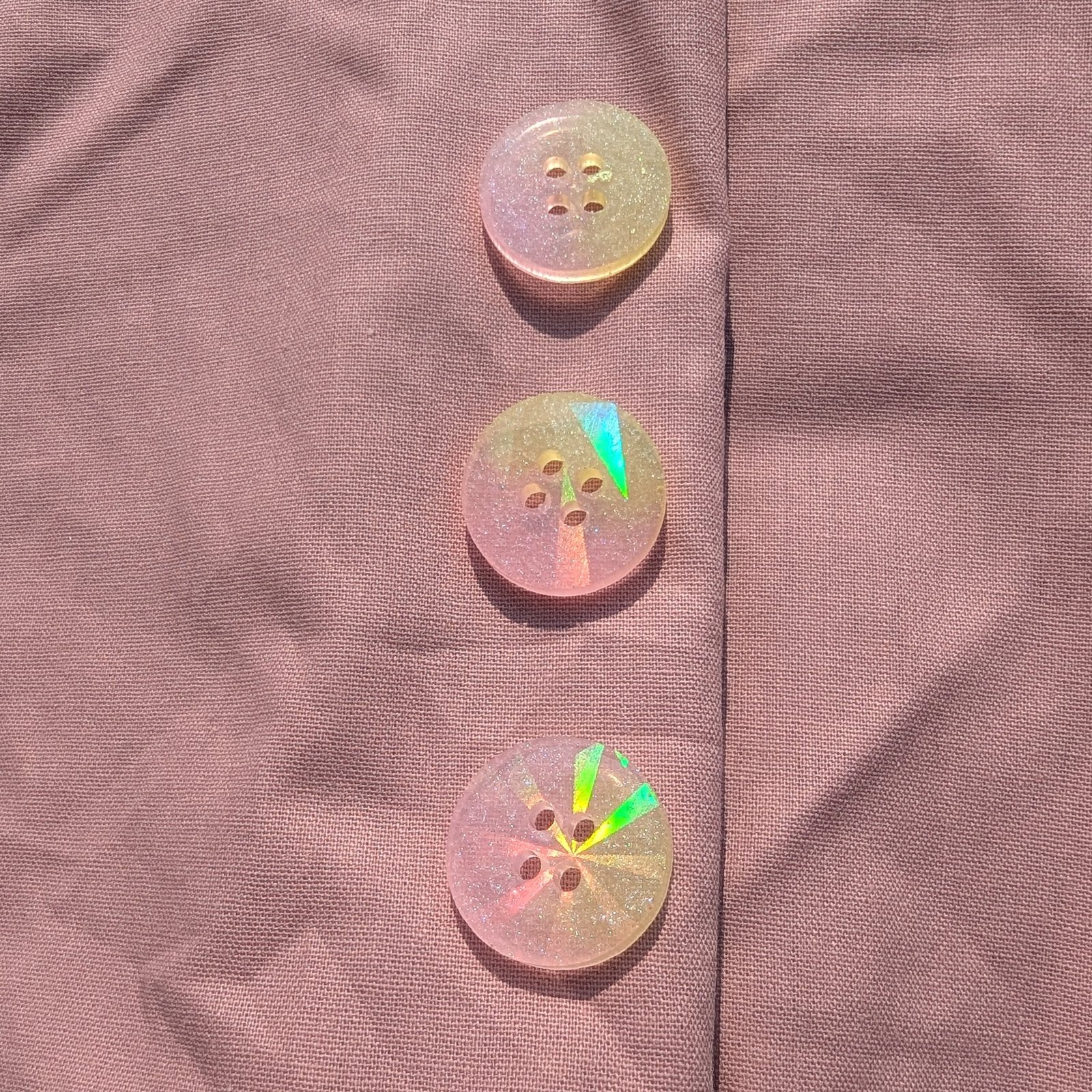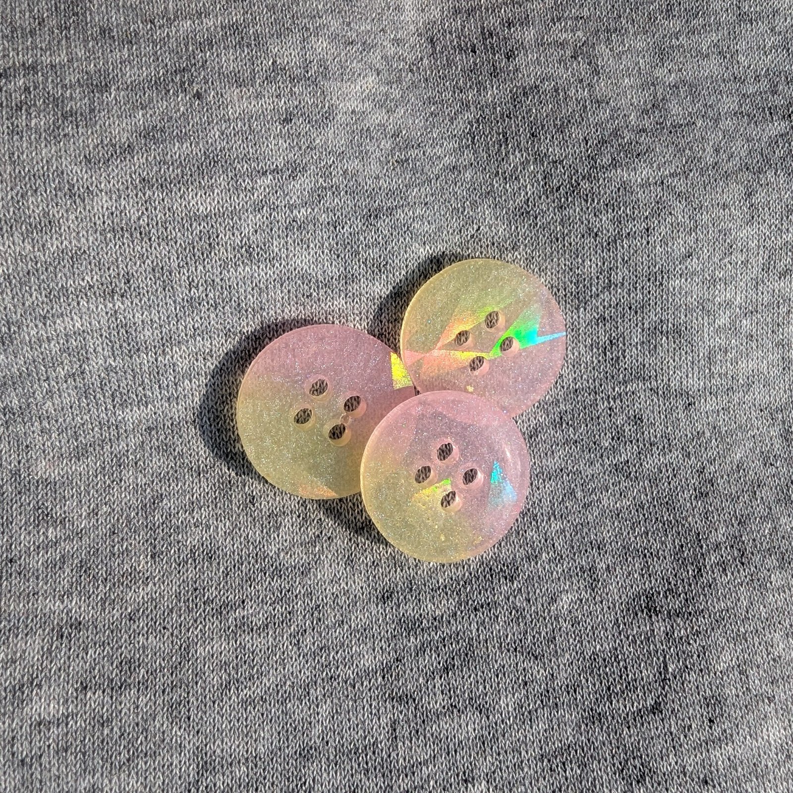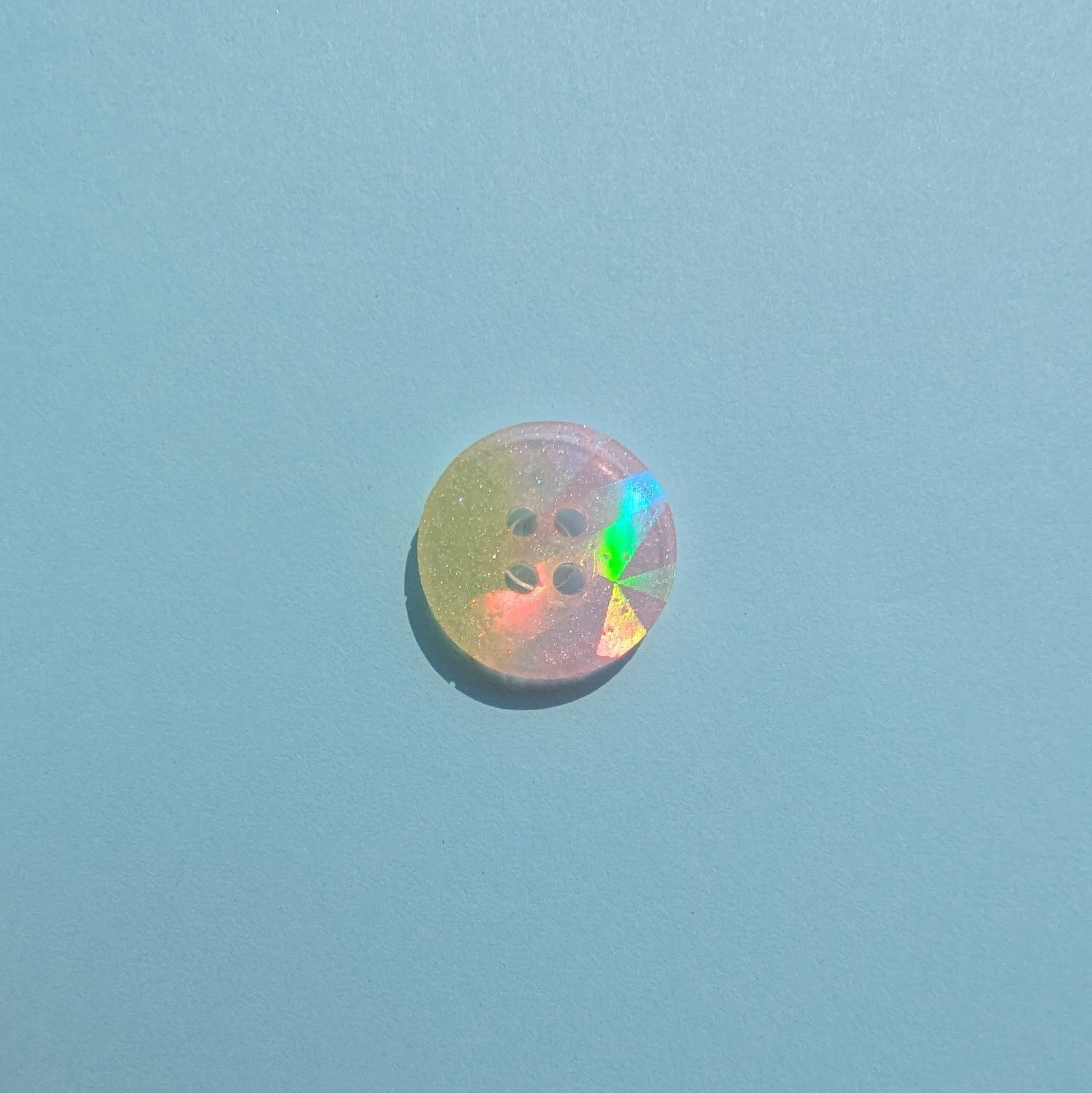 Der Knopf „Gaby“ ist ein Kopf aus Epoxidharz in zartem Rosa/Gelb und einer Holografischen Oberfläche. Er hat einen Durchmesser von 20mm.