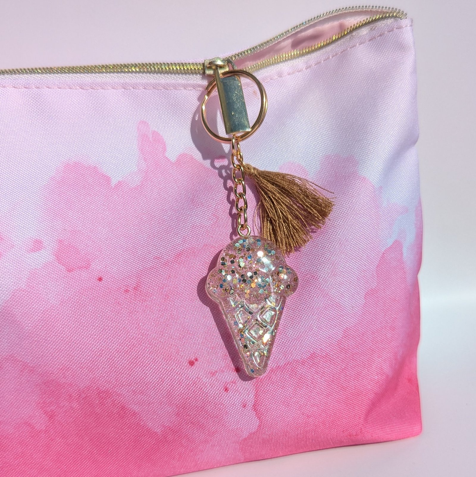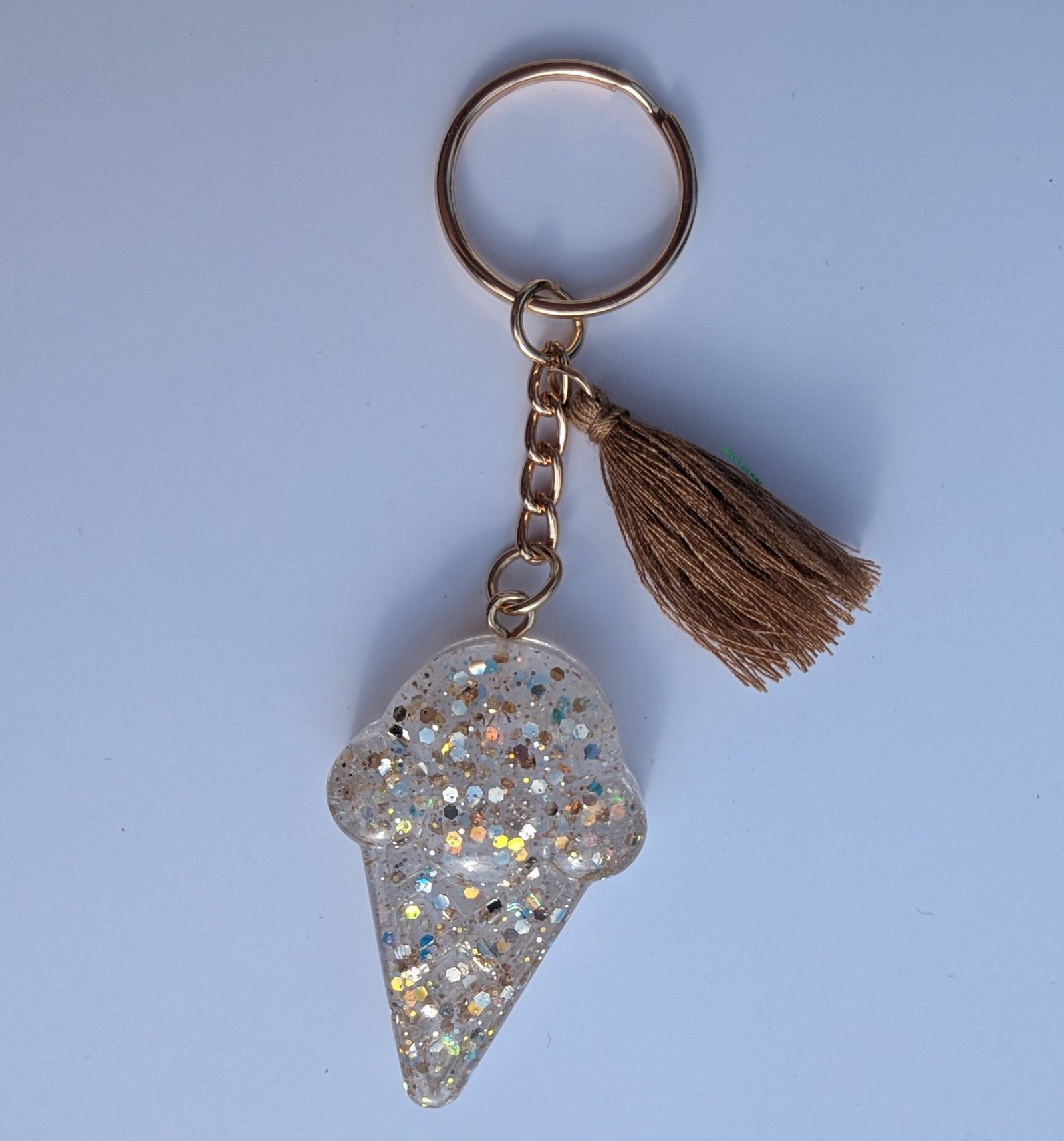 Schlüsselanhänger im Eis Design in Campagner Glitzer, hell Goldenem Schlüsselring und hell Brauner Quaste.